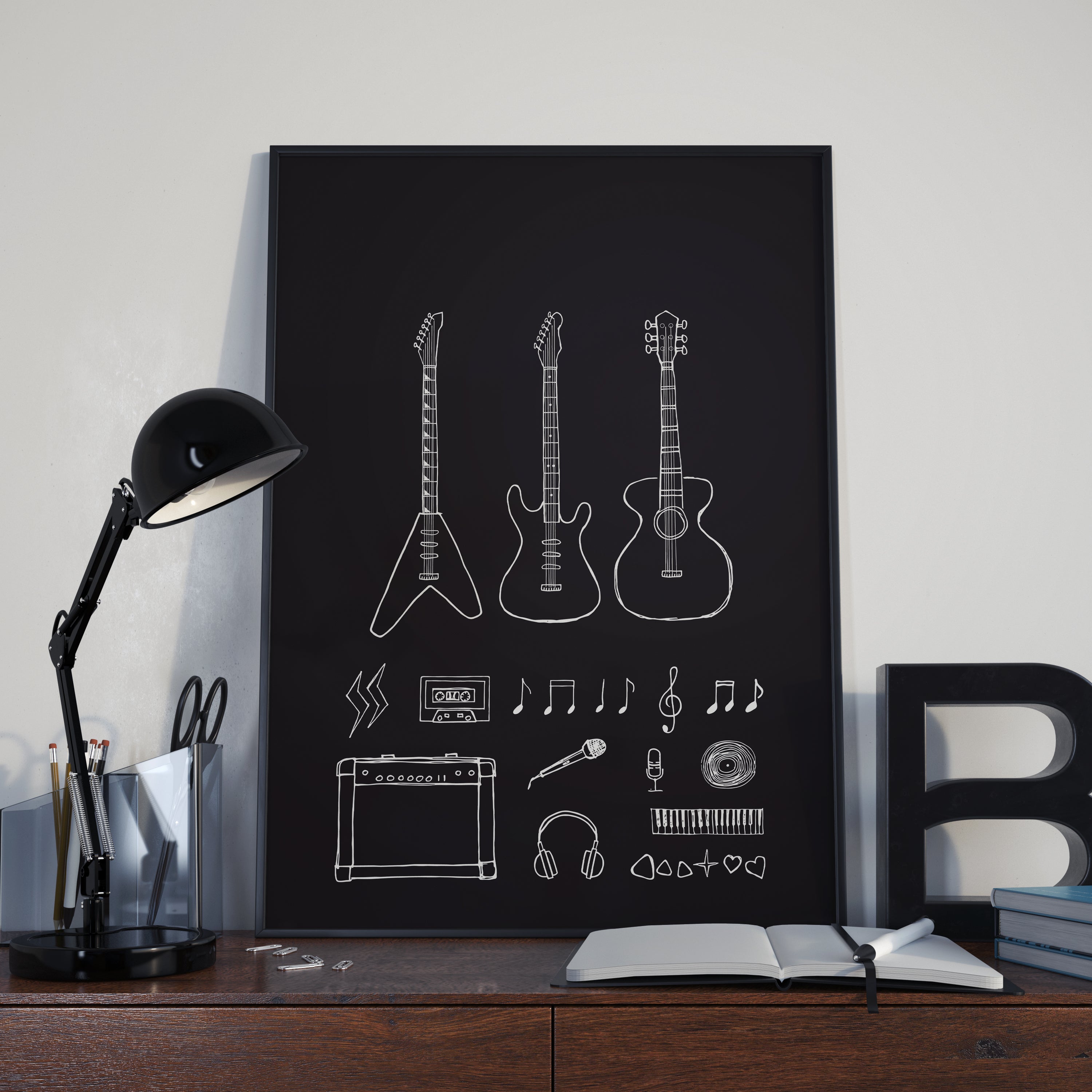 Whether you're decorating a studio, jam room, teen’s bedroom, or music corner, this poster brings a cool, rock-and-roll vibe to any space. The monochrome sketch style blends seamlessly with modern, industrial, or vintage décor, making it a must-have for guitarists, band members, and anyone passionate about sound.