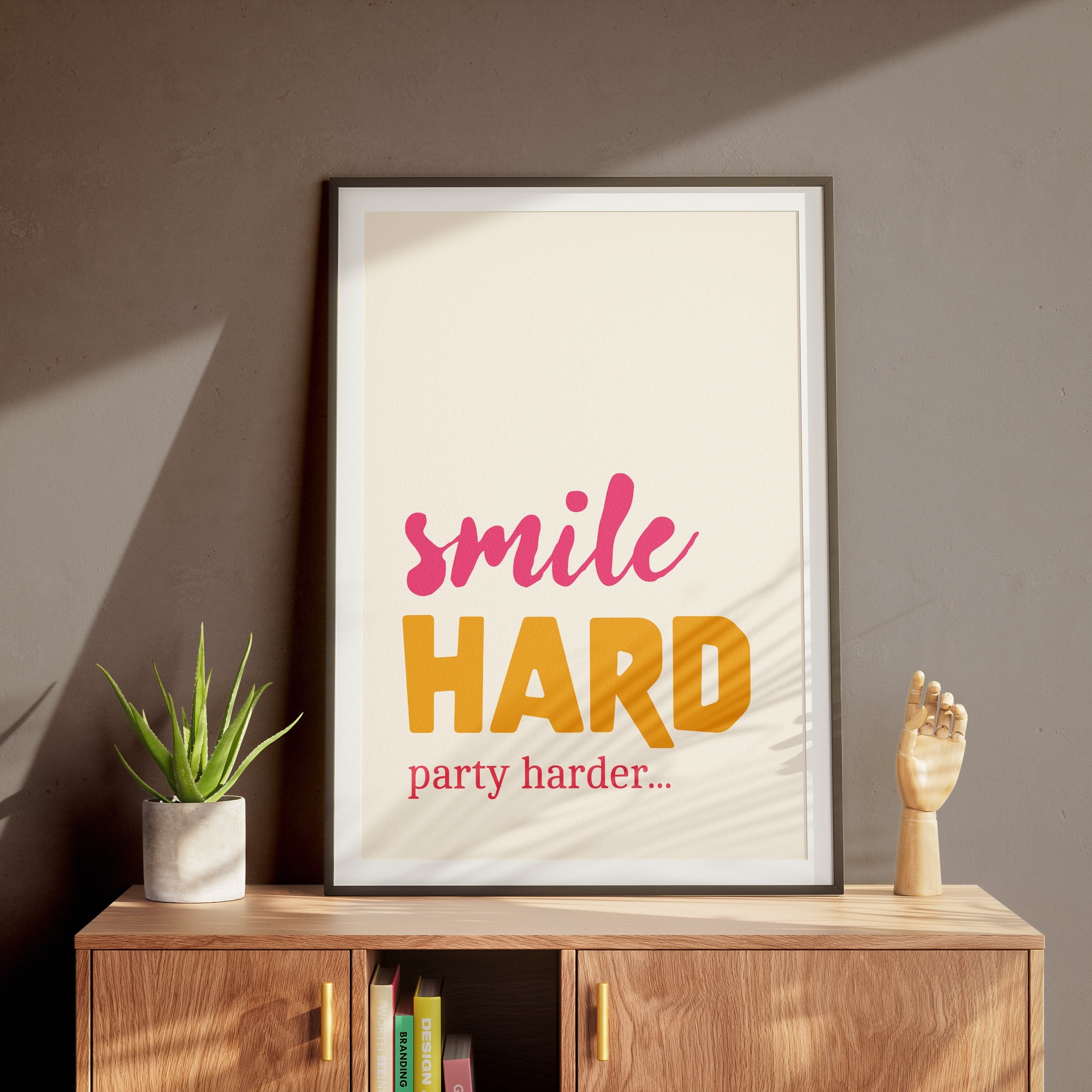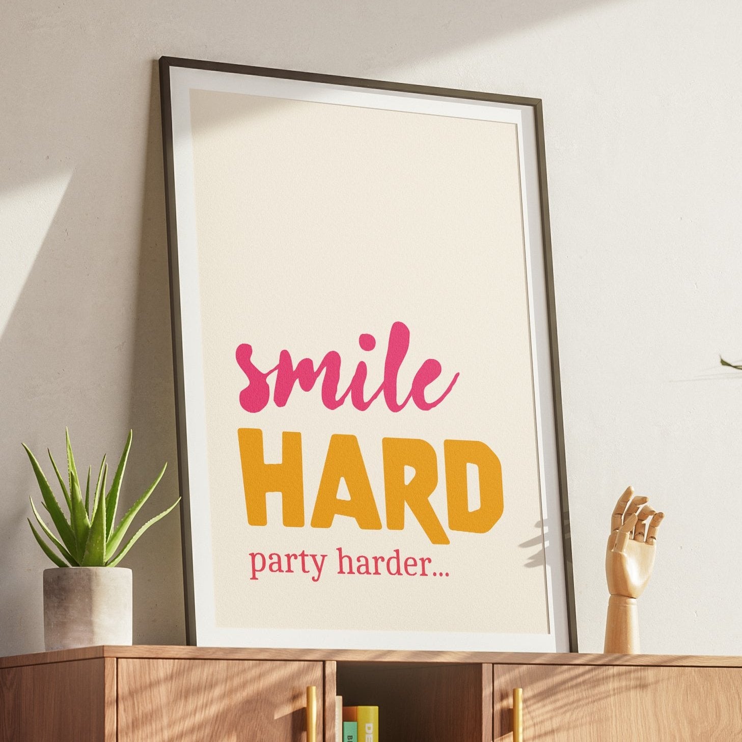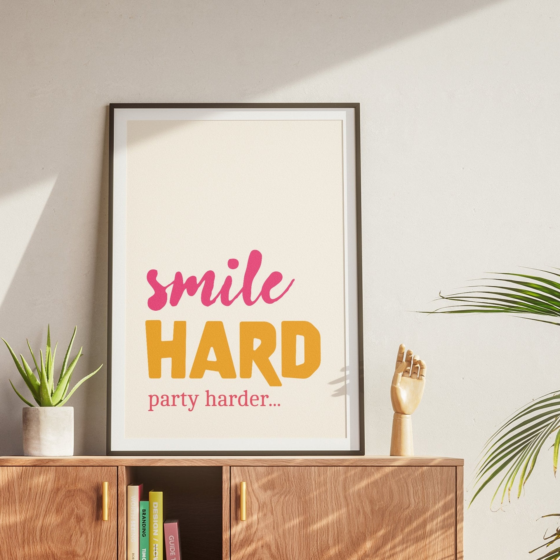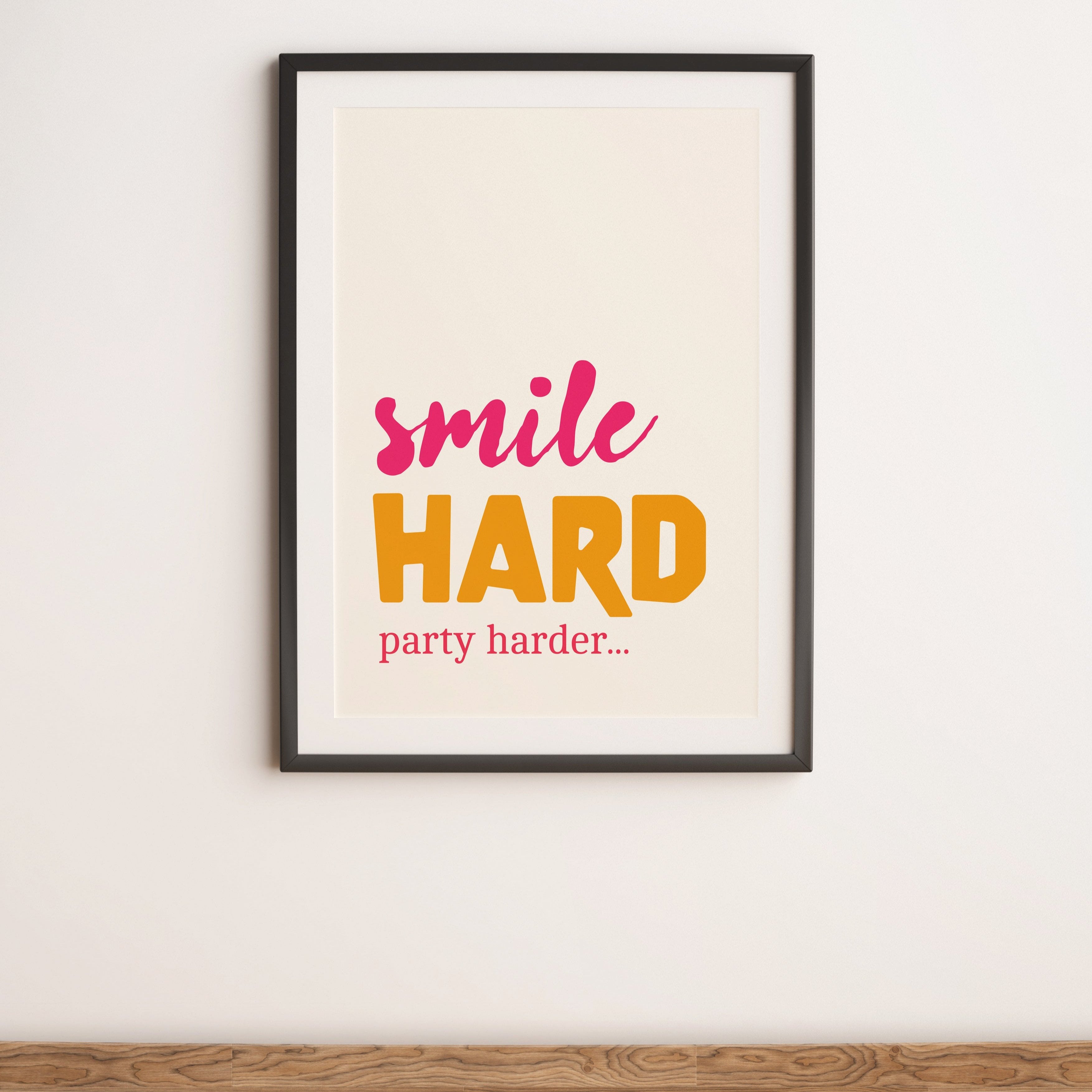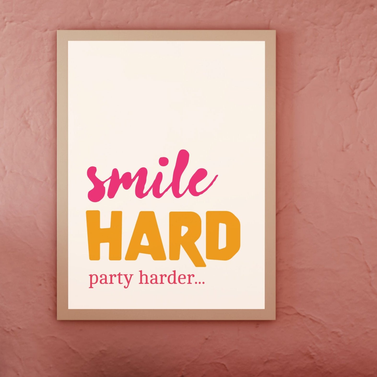 'Smile hard, party harder' is a bright, fun original quote poster in bright pink, yellow and orange. Instant download wall art, minimalist modern artwork, sleek and fun design. Perfect for a new pop of colour on your walls. Bright artwork to lighten up any room.