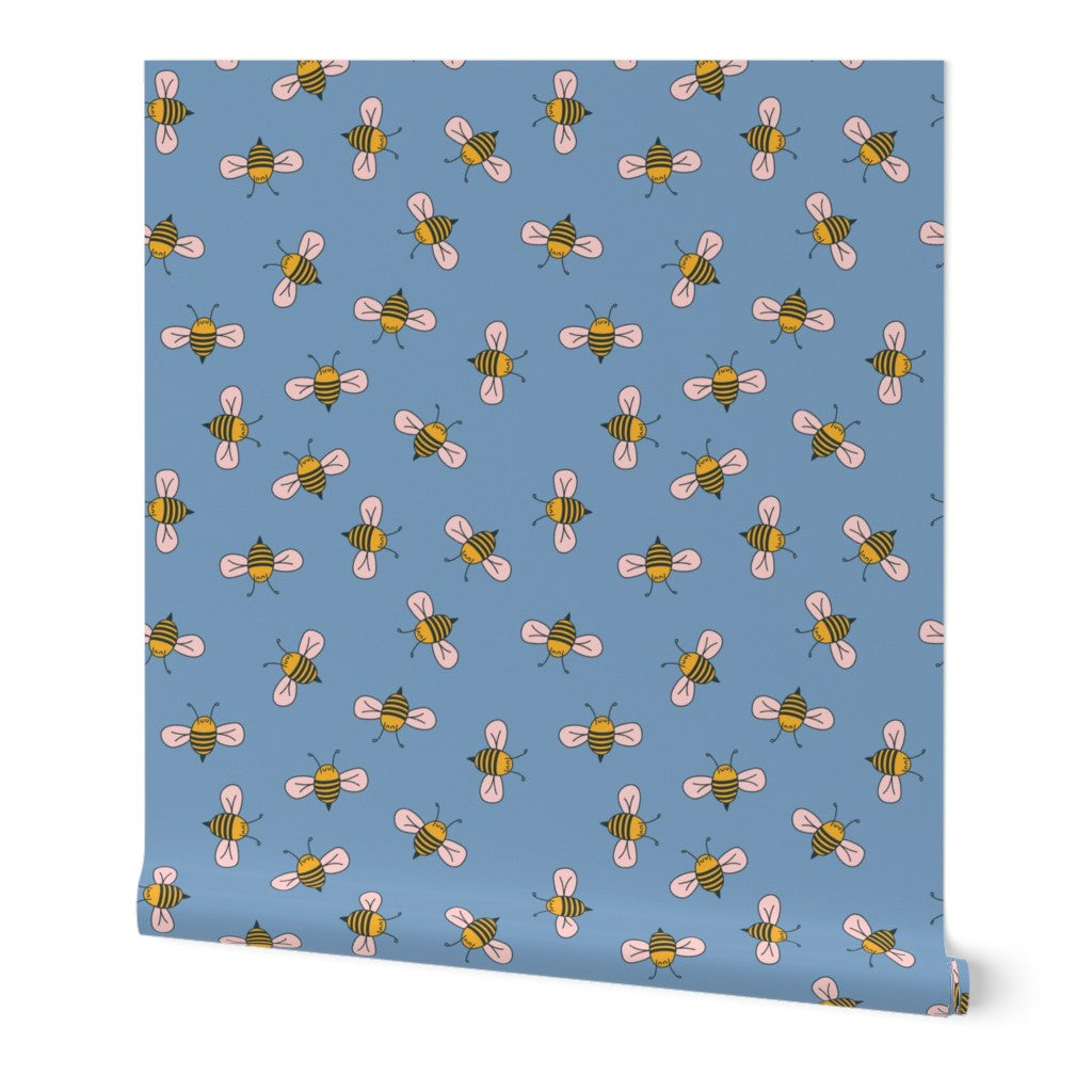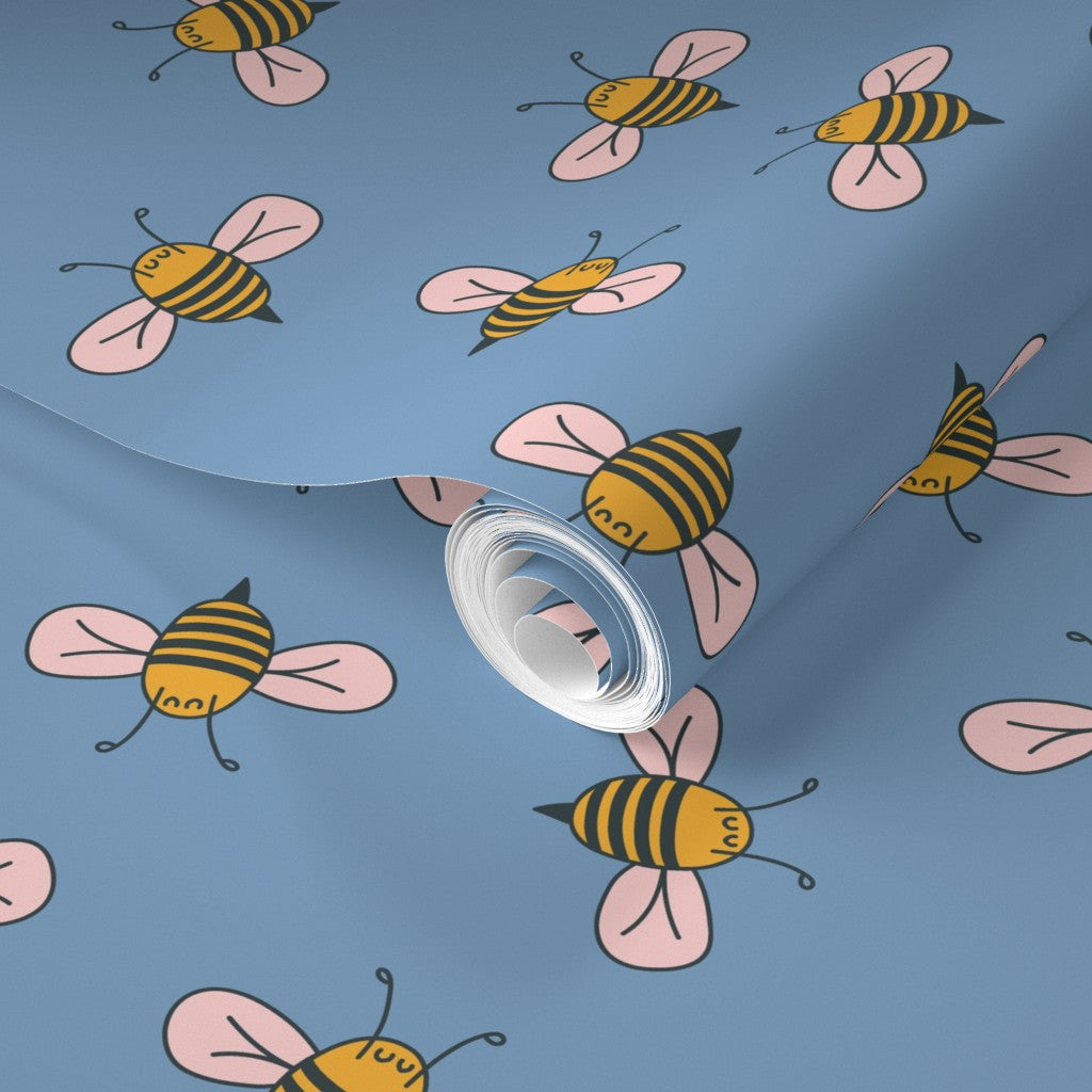 Cute hand drawn bees buzzing around on a blue background. Perfect for nurseries and children's clothes.