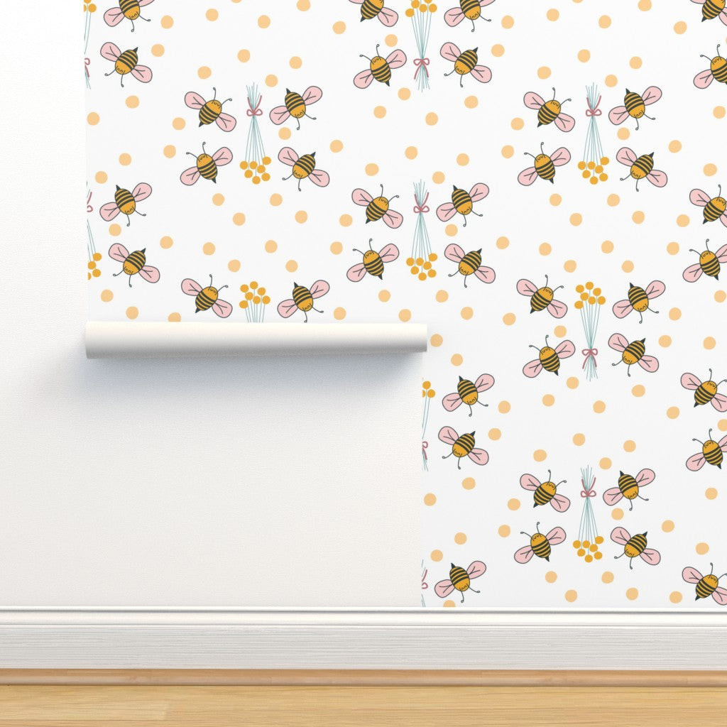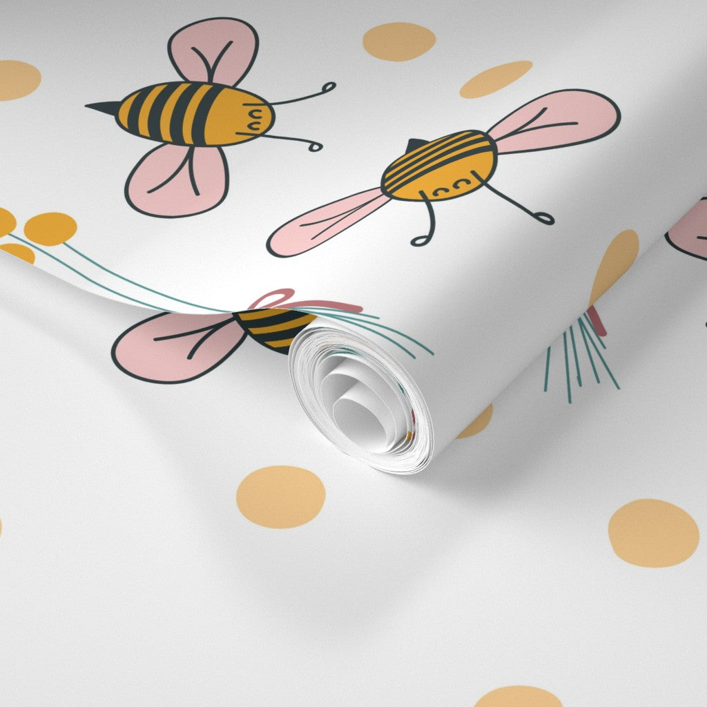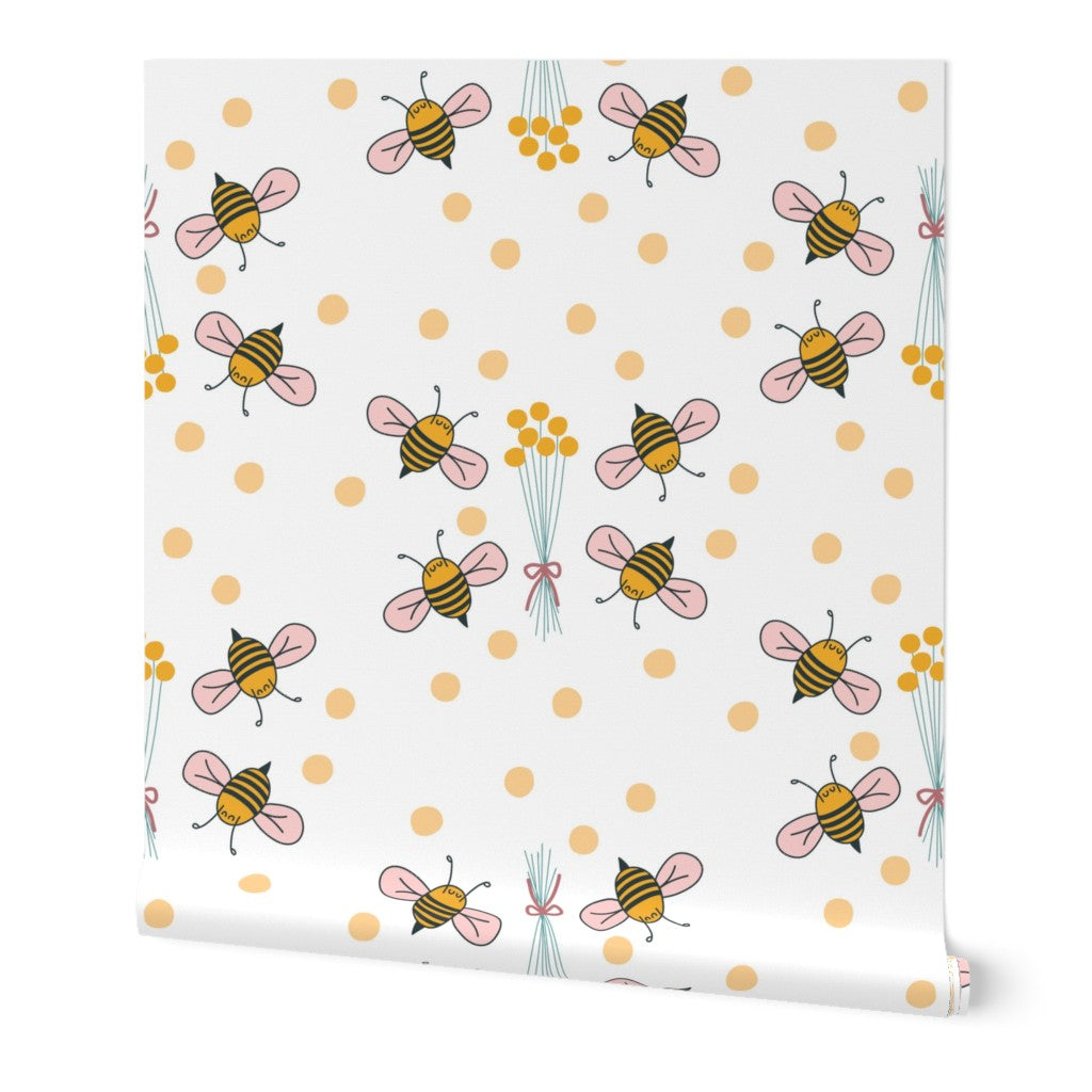 Cute hand drawn bees and billy buttons on a white background. Bees flying around the billy button bouquet creates a diagonal pattern.