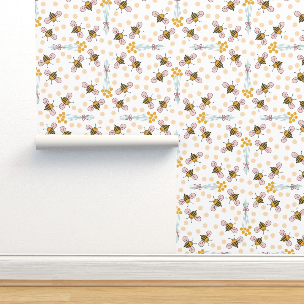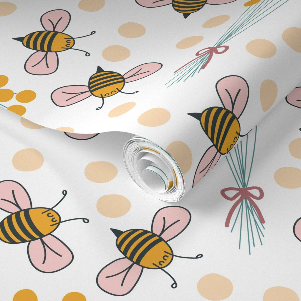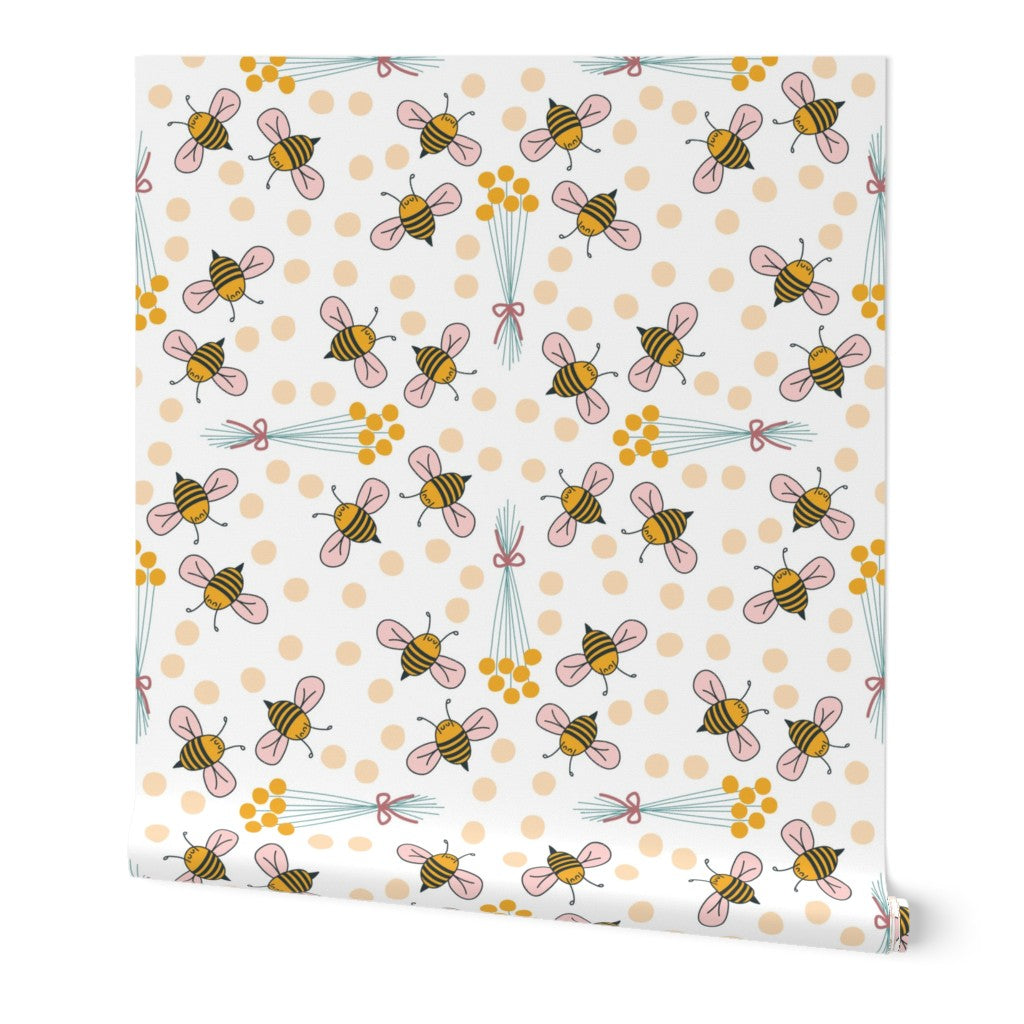 Cute hand drawn bees and billy buttons on a white background. Billy button bouquets are placed in a grid fashion.