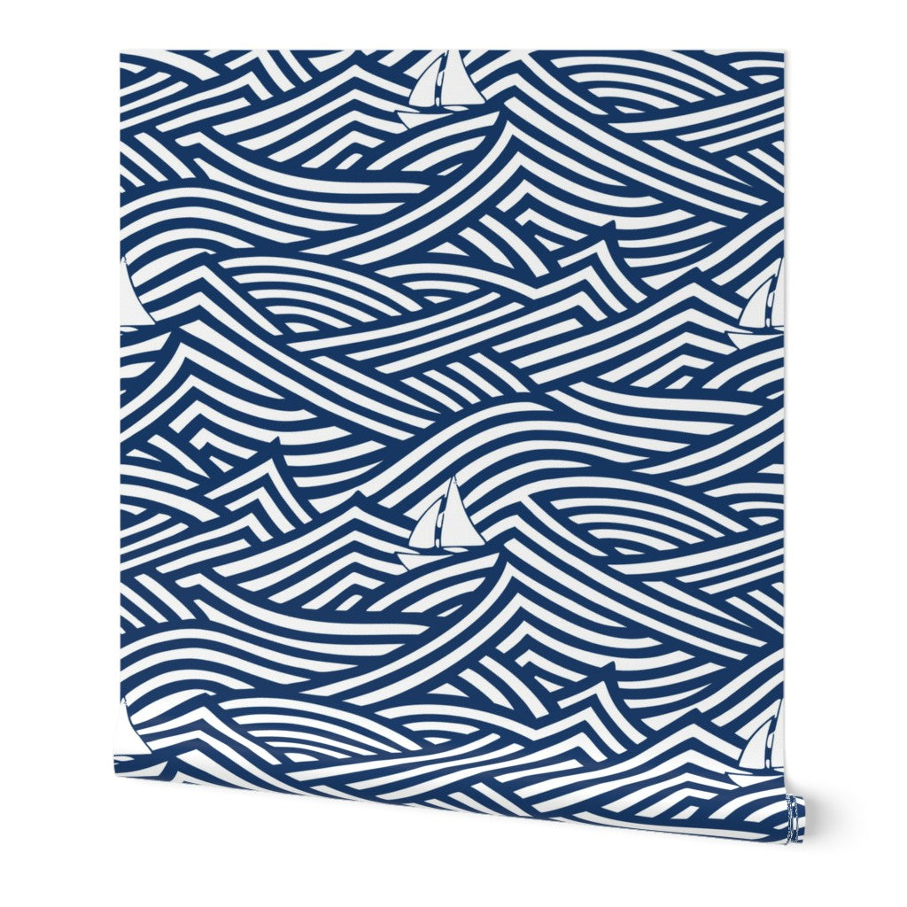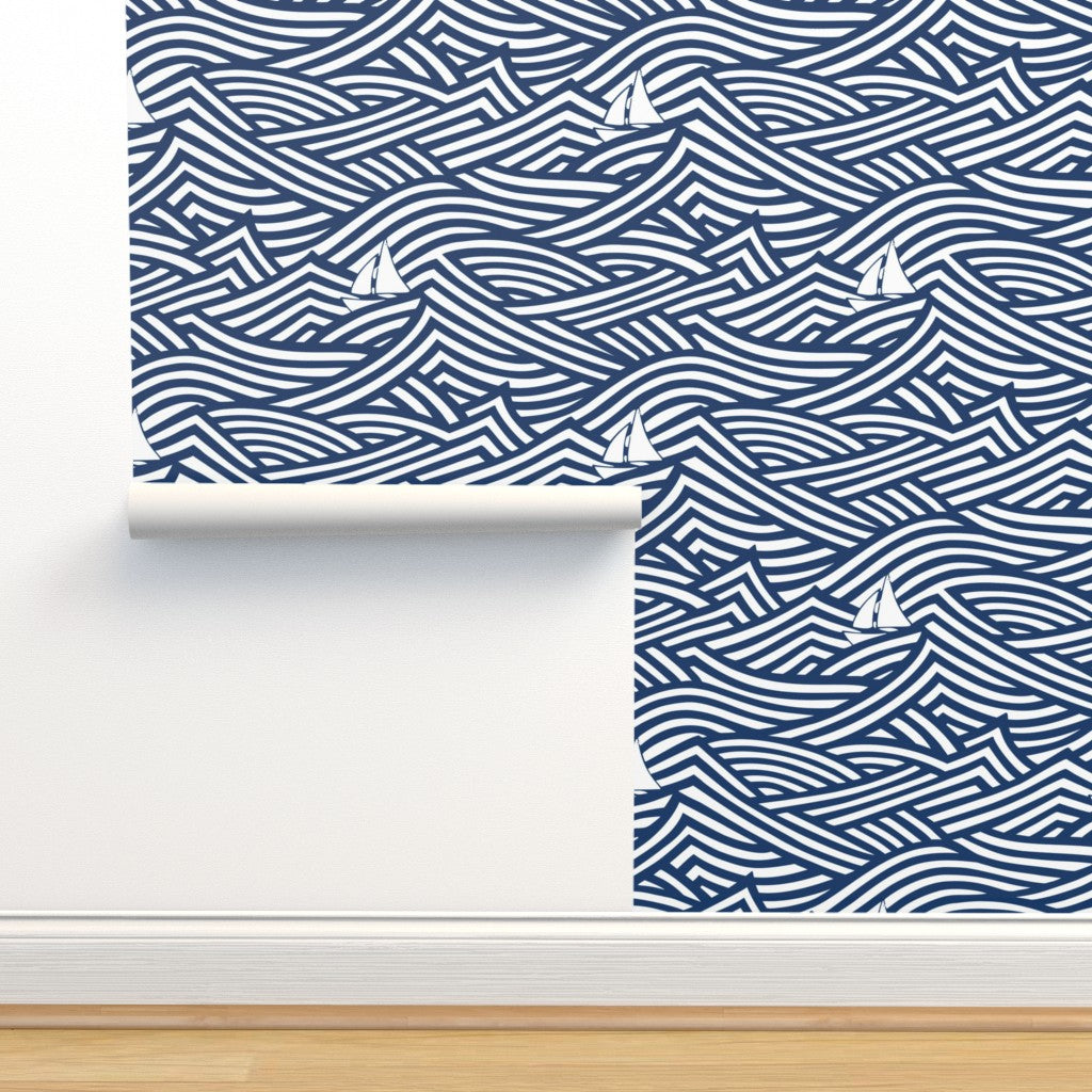 Rough sea with little sail boat - navy and white ~ Wallpaper