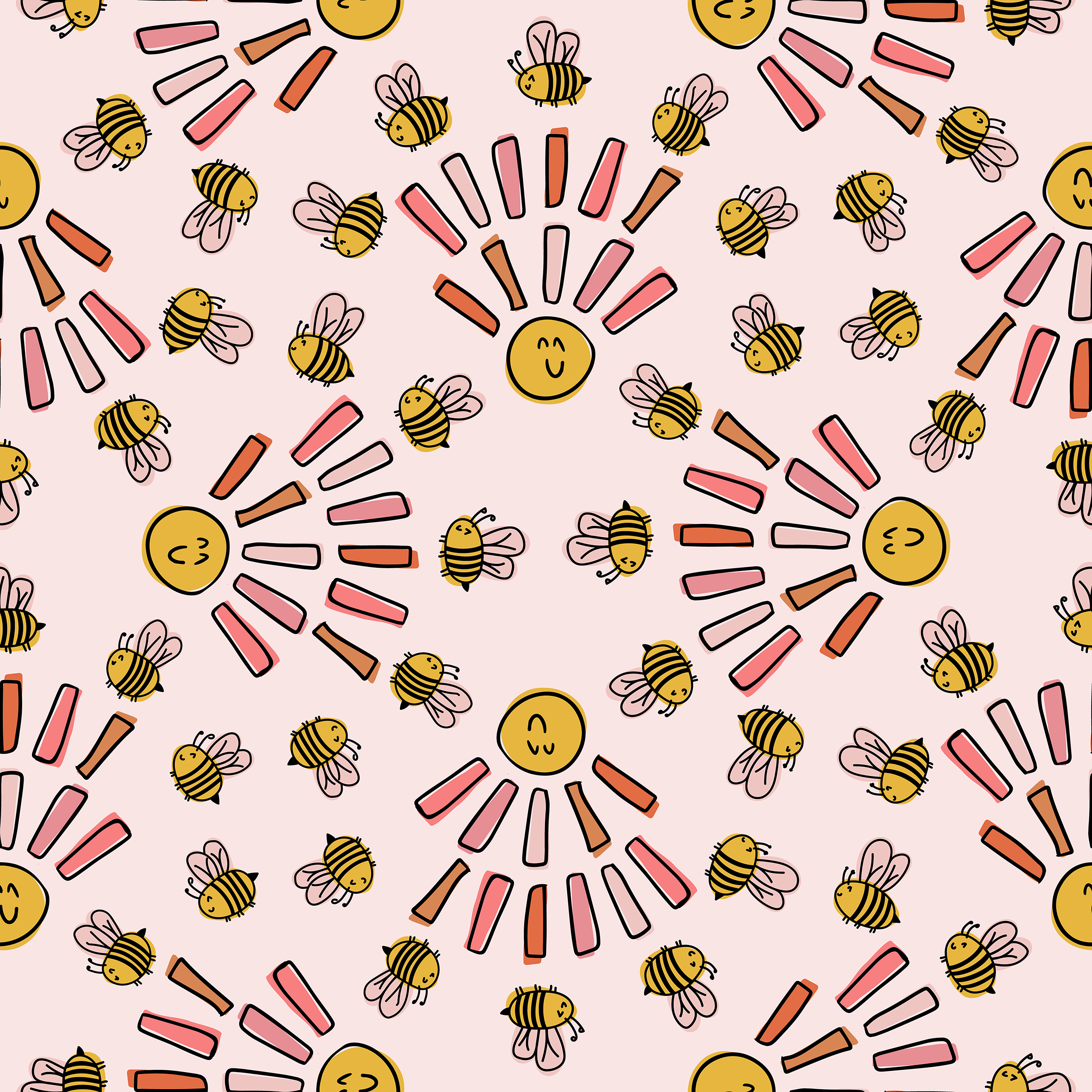 Cute hand drawn bees buzzing around a sun with a pale pink background.