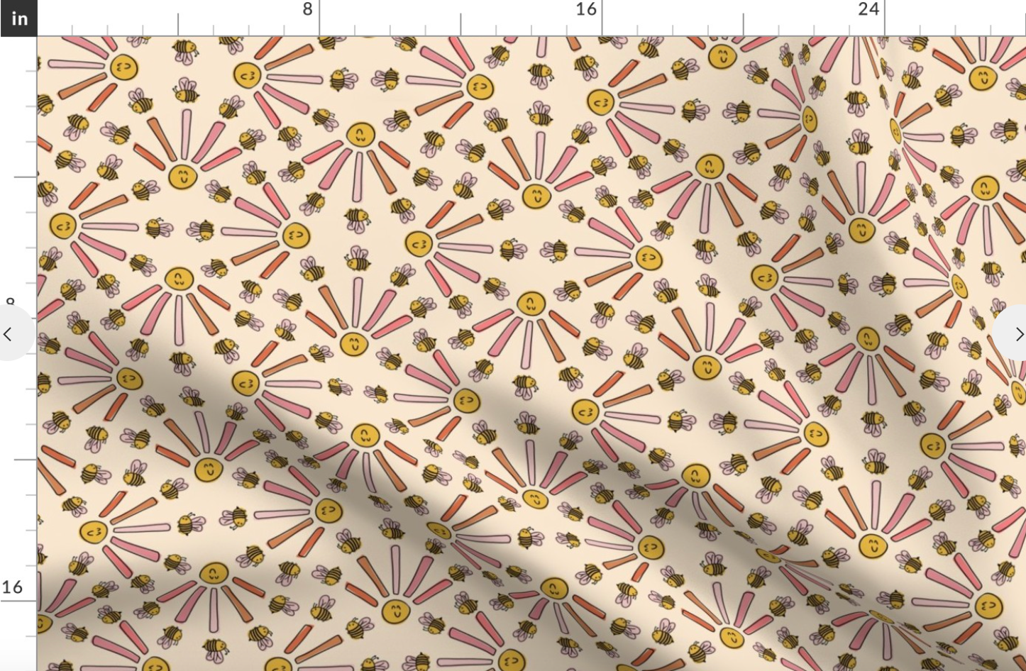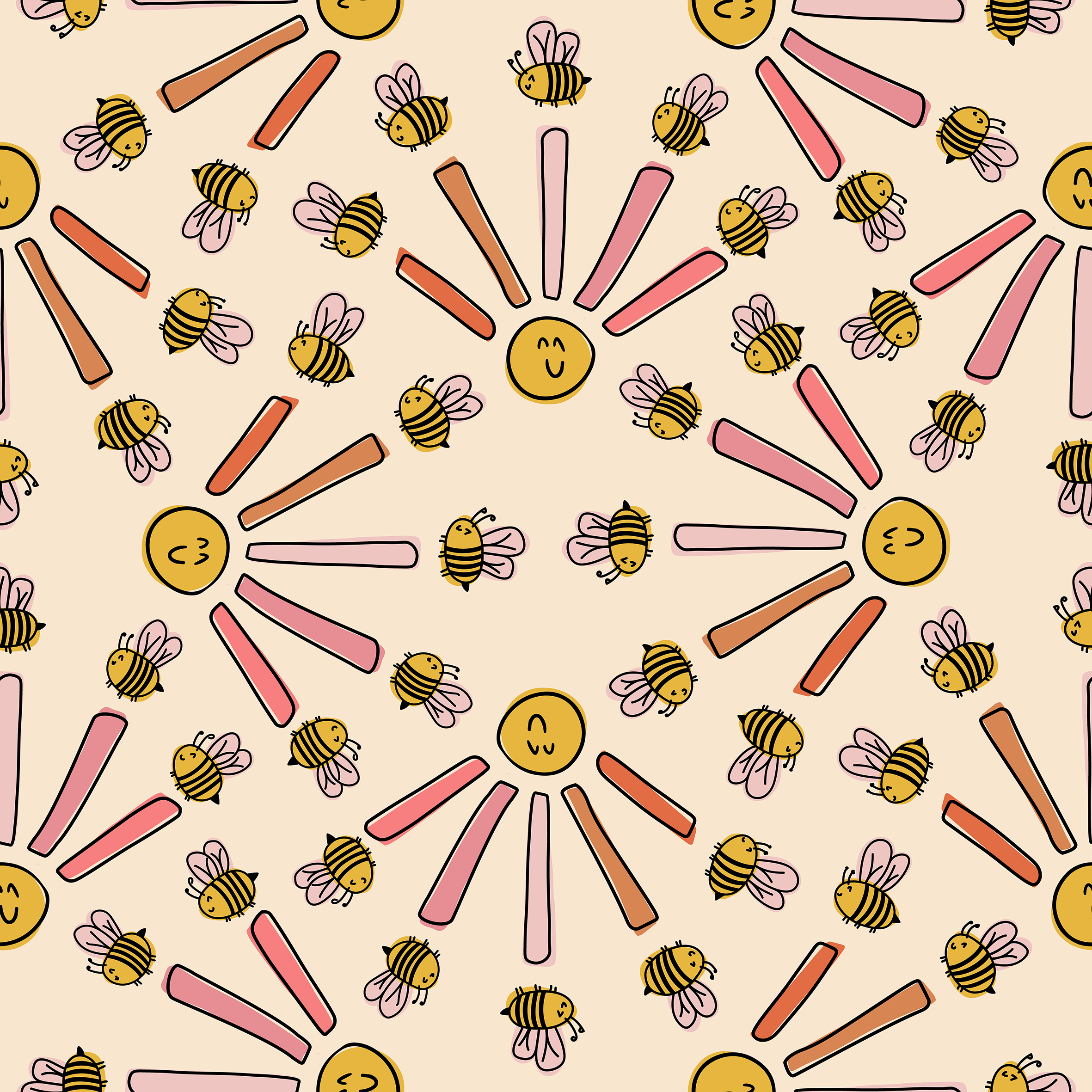 Cute hand drawn bees buzzing around a sun with a pale yellow background.