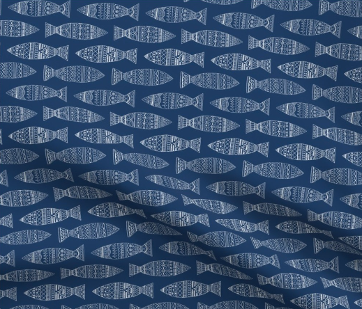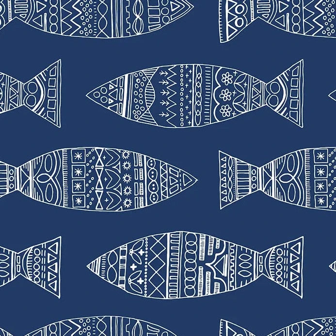 These Portuguese doodle sardines are in white on a blue background, and are a part of the Coastal Collection.
