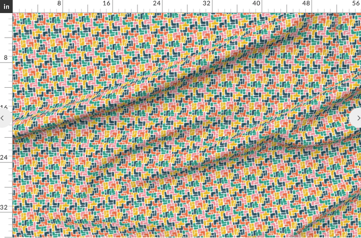The pillars are little rectangles stacked on top of each other, the blocks resemble the game tetris and all sit neatly together, and the threads look like left over colourful threads after a sewing experience.