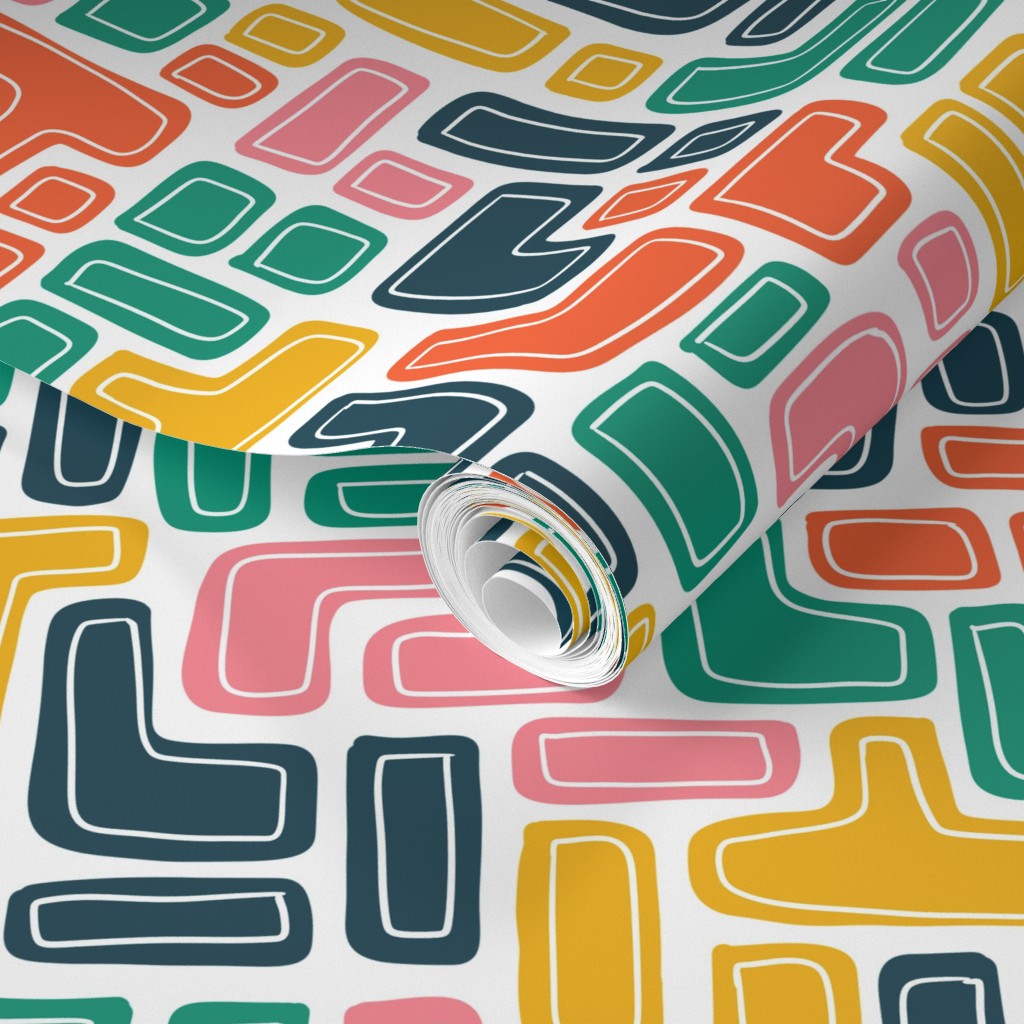 Hand drawn colourful lines and blocks creating a tetris effect. Colours used are pink, red, yellow, green and blue.