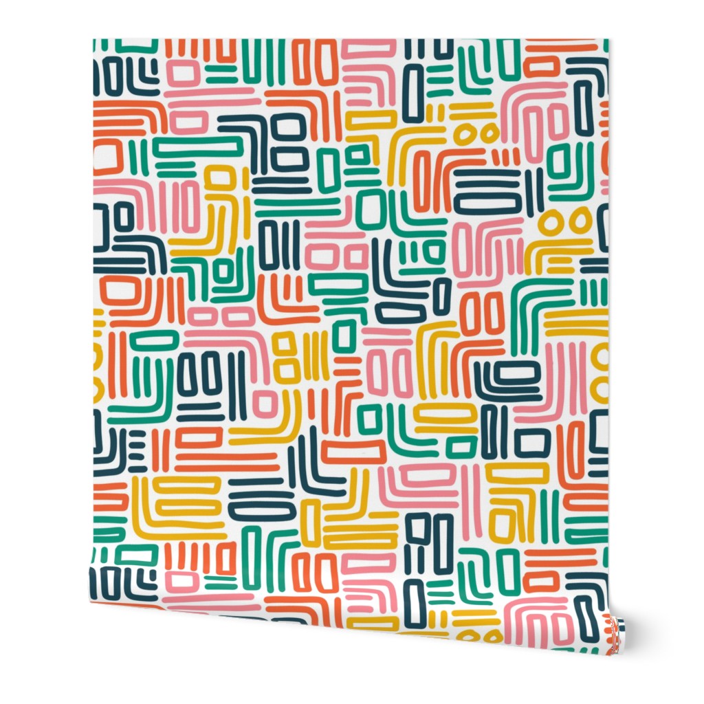 Hand drawn colourful lines which look like lots of loose left-over threads. Colours used are pink, red, yellow, green and blue.