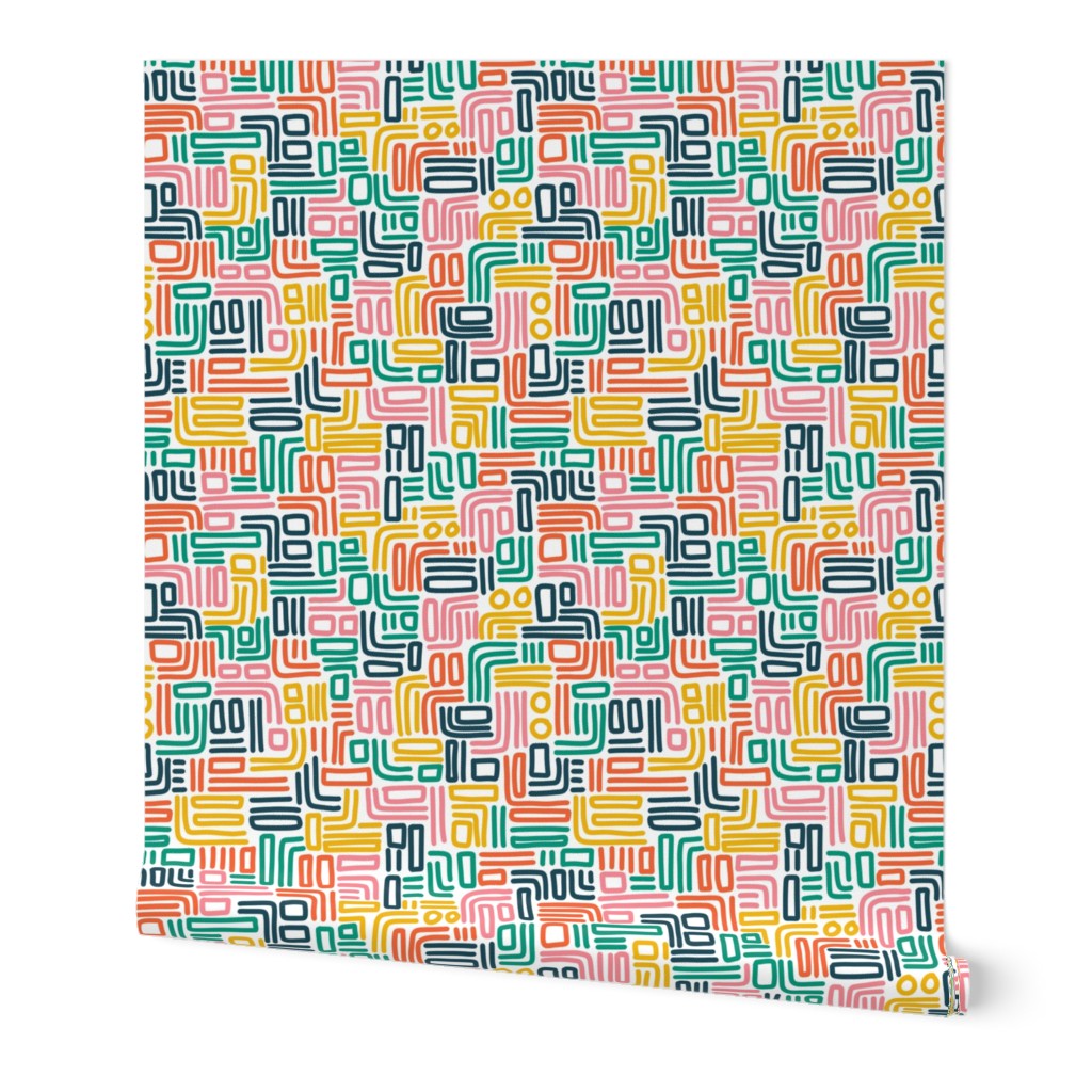 Hand drawn colourful lines which look like lots of loose left-over threads. Colours used are pink, red, yellow, green and blue.