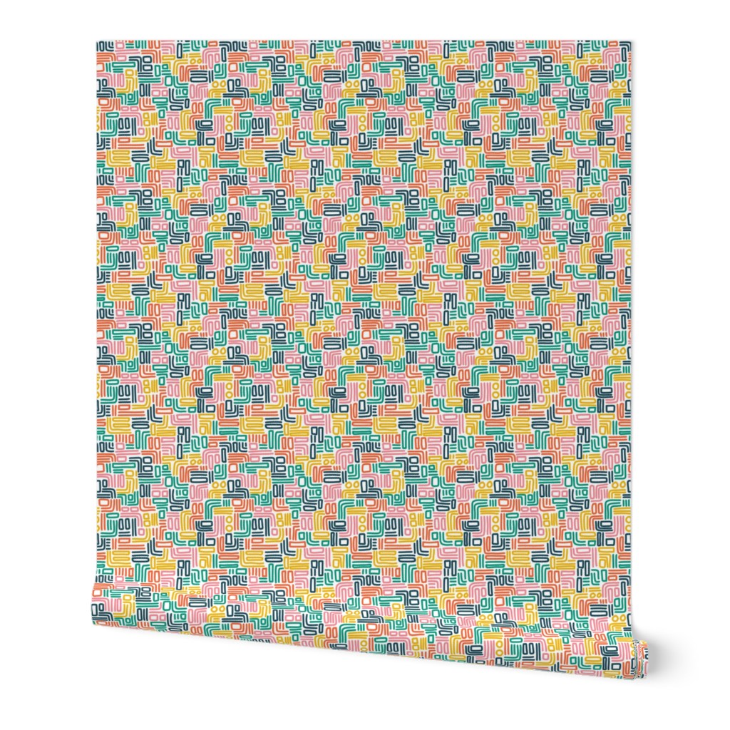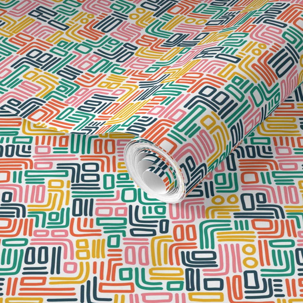 Hand drawn colourful lines which look like lots of loose left-over threads. Colours used are pink, red, yellow, green and blue.