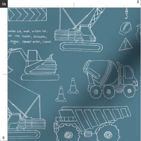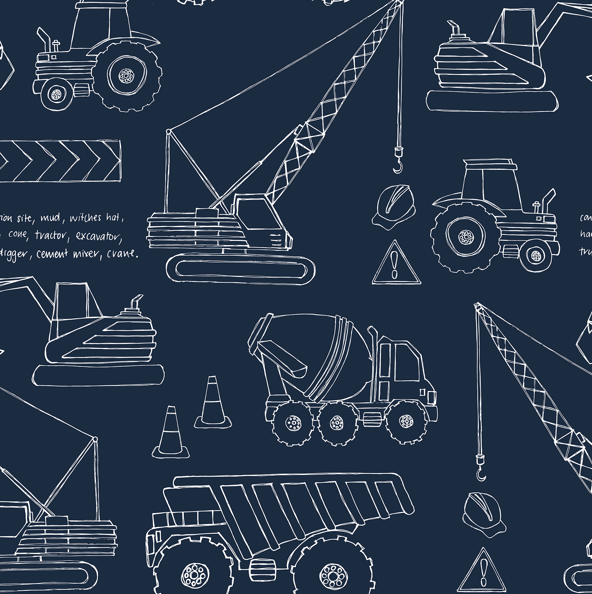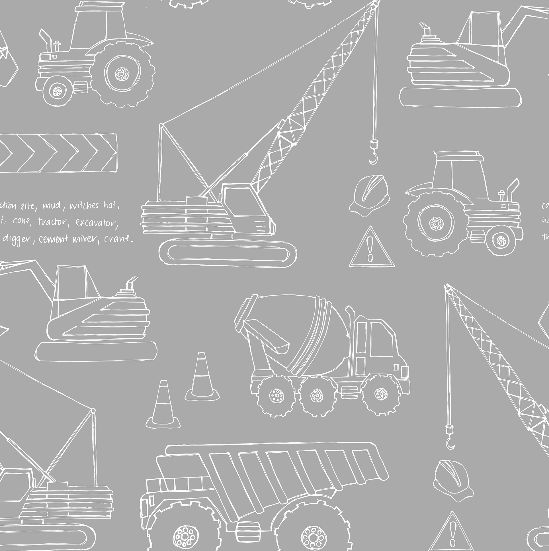 The words in the design read: 'construction site, mud, witches hat, hard hat, cone, tractor, excavator, truck, digger, cement mixer, crane.'