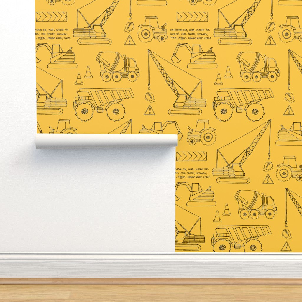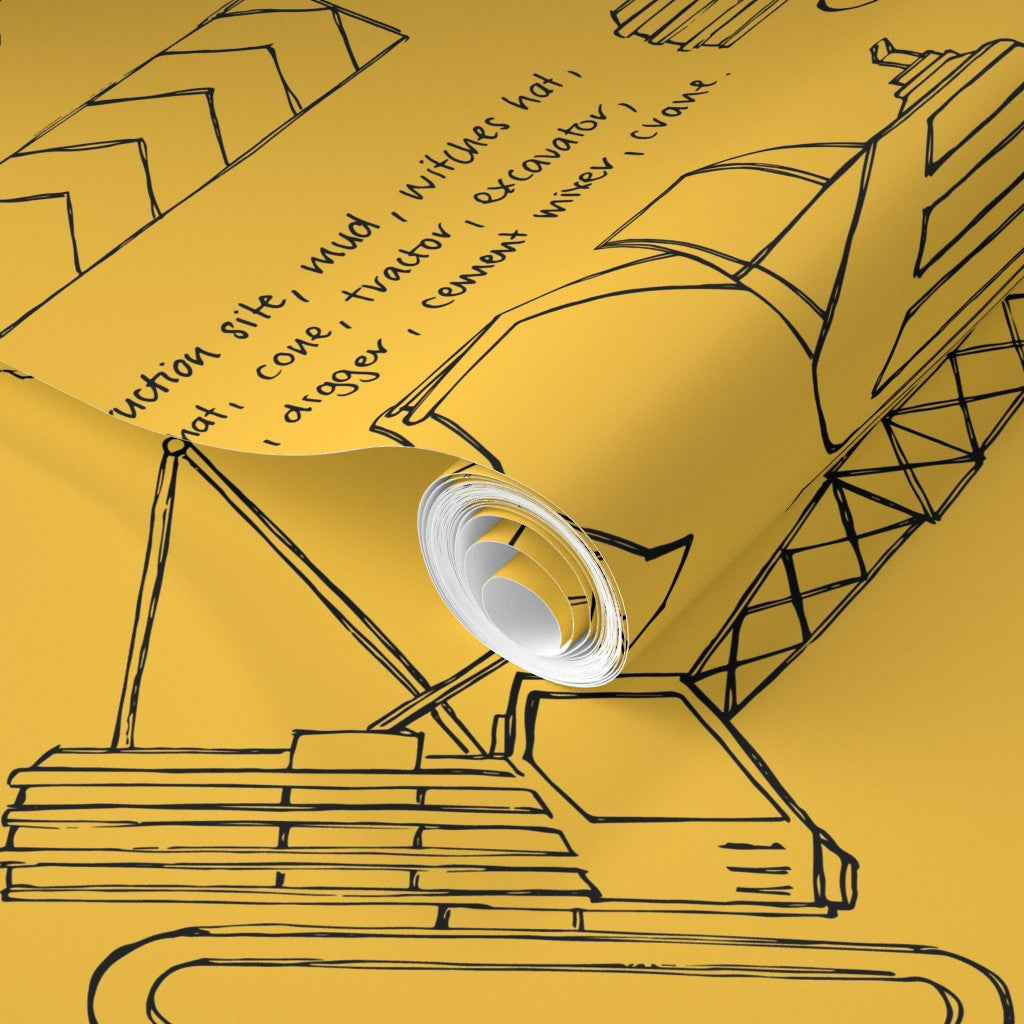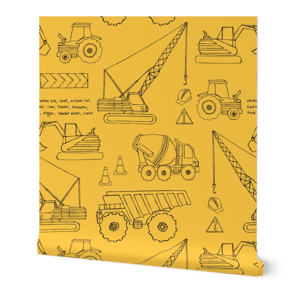The vehicles include a crane, tractor, truck, excavator and cement mixer. There are hard hats, signs and cones also scattered about, and the words in the design read: 'construction site, mud, witches hat, hard hat, cone, tractor, excavator, truck, digger, cement mixer, crane.'