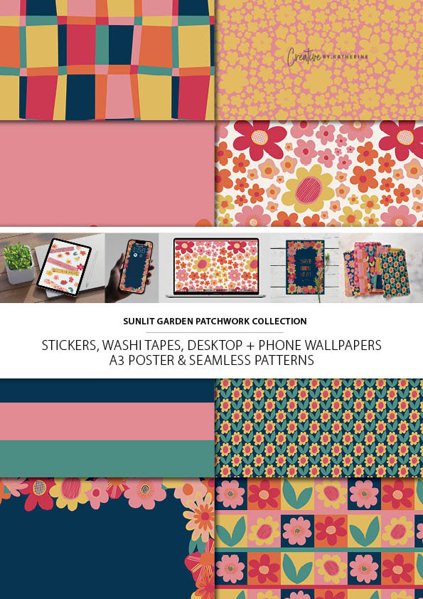 A complete, versatile digital design collection inspired by layered florals, playful patchwork, and warm, sunlit colour palettes.