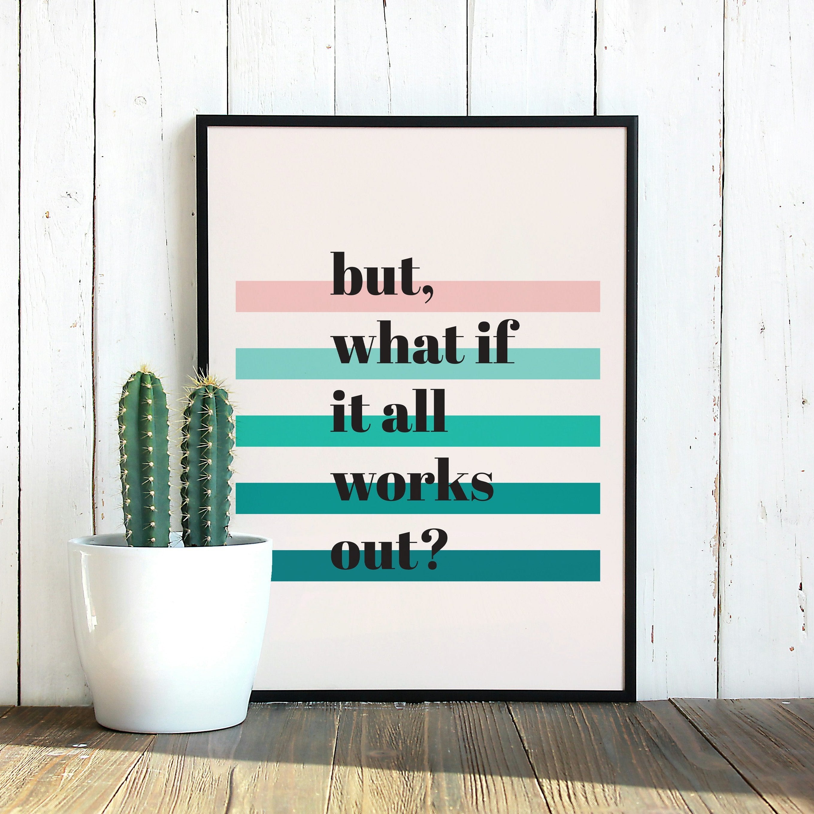 Colourful quote digital download printable wall art. Pale pink background with one stripe of pink and 4 stripes of mint green in different tones under the quote words.
