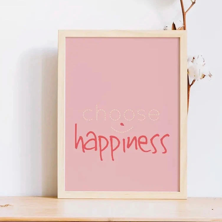 Choose happiness poster has a light pink background with yellow and orange/red writing. Theres a sneaky little smiley face in the middle.