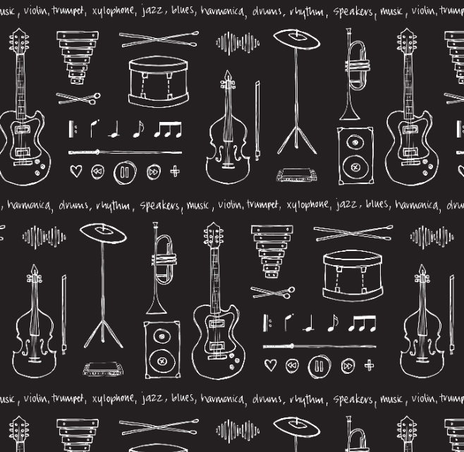 Band Practice brings the full orchestra to life in a playful, hand-drawn repeat. Guitars, violins, trumpets, drums, speakers and musical notes are scattered across a dark grey ground, layered with subtle playback icons and handwritten music words. Energetic yet relaxed, this print captures the joy of jam sessions and creative afternoons.
