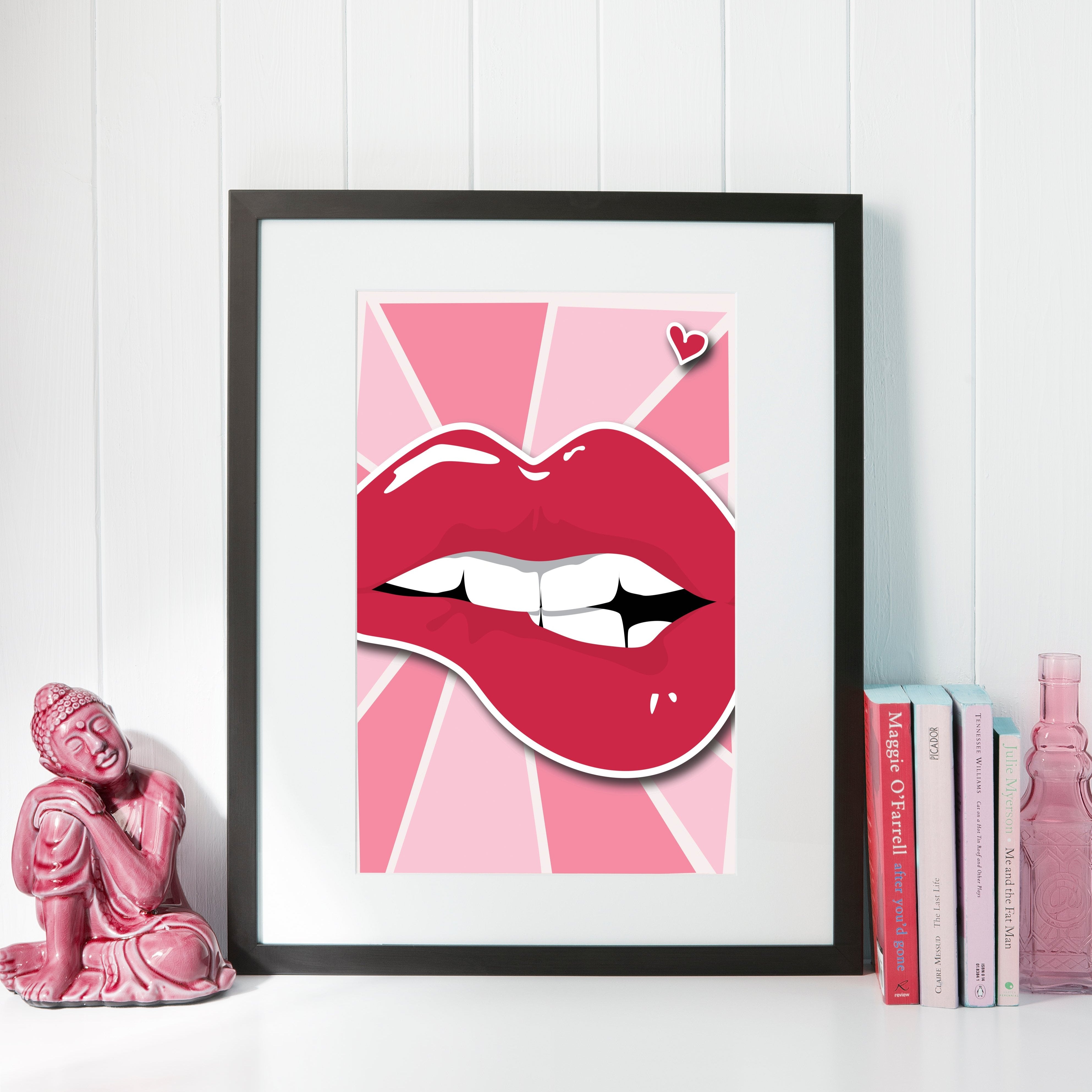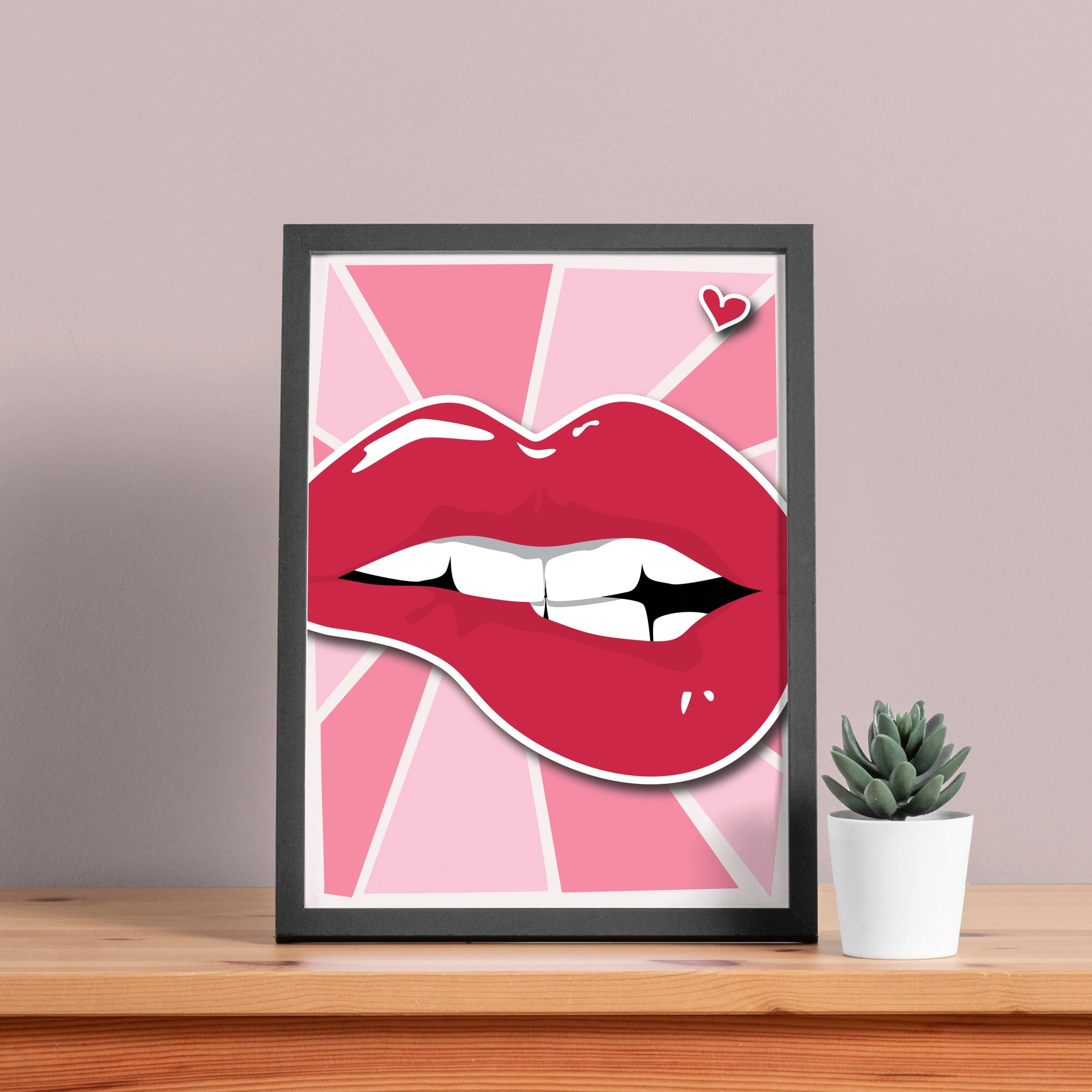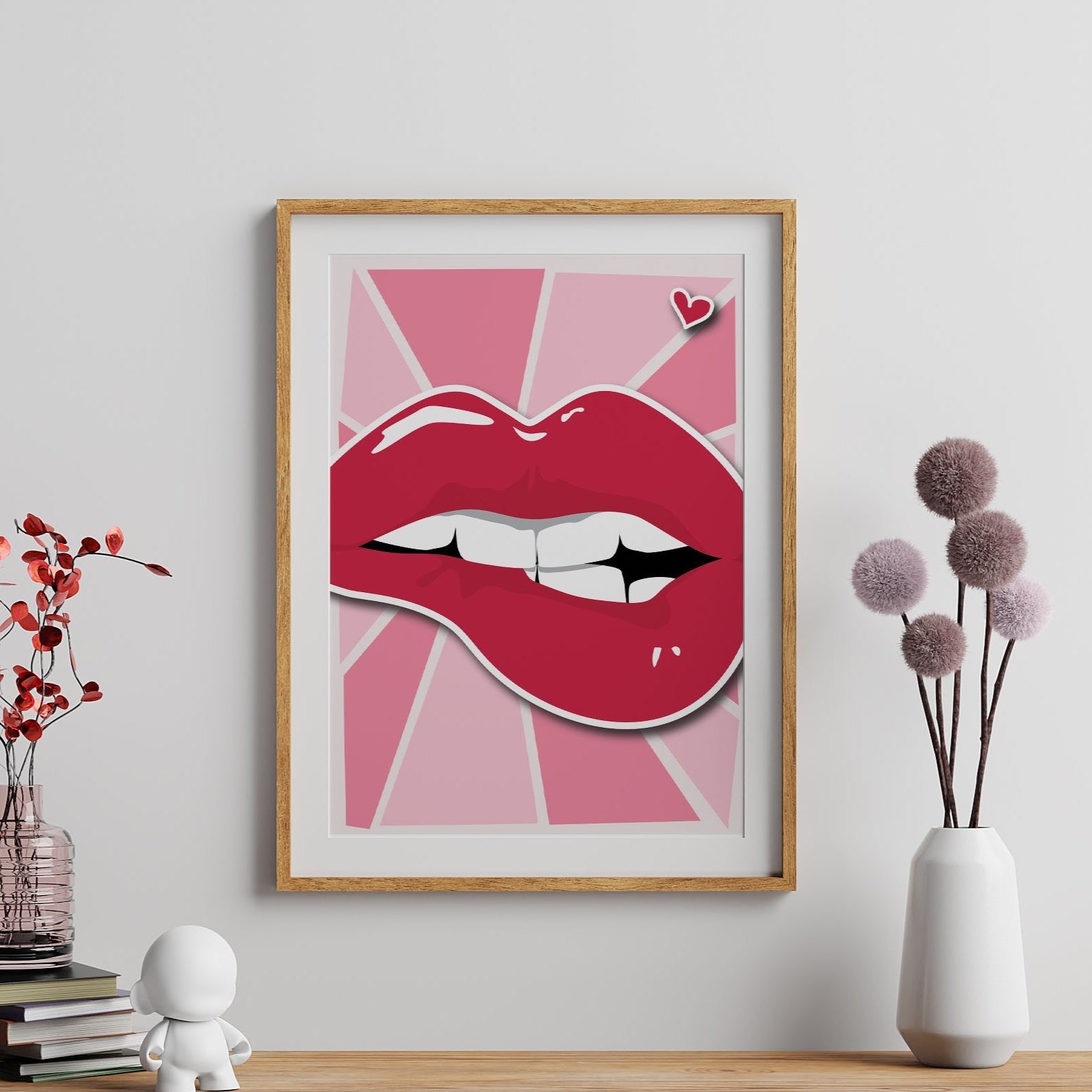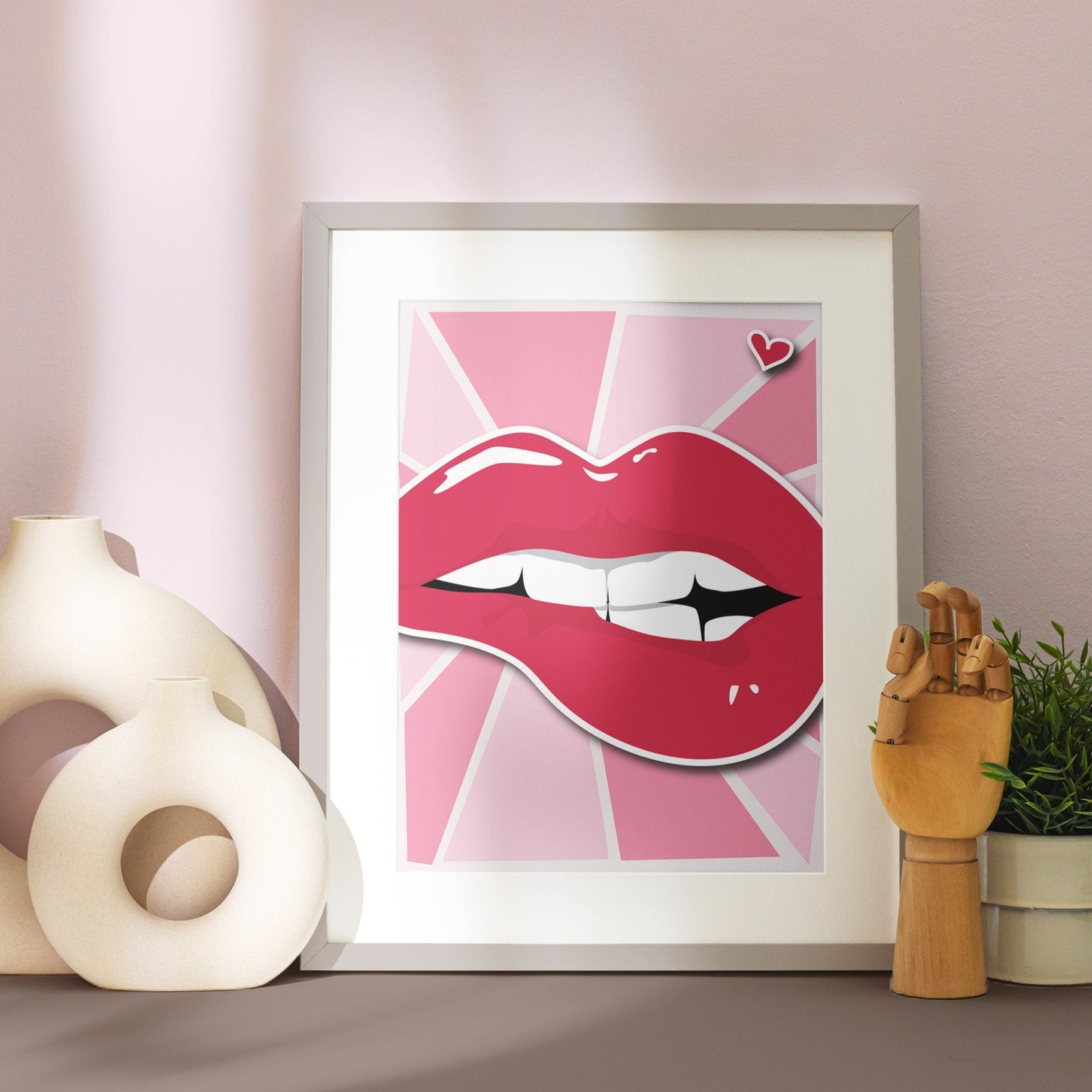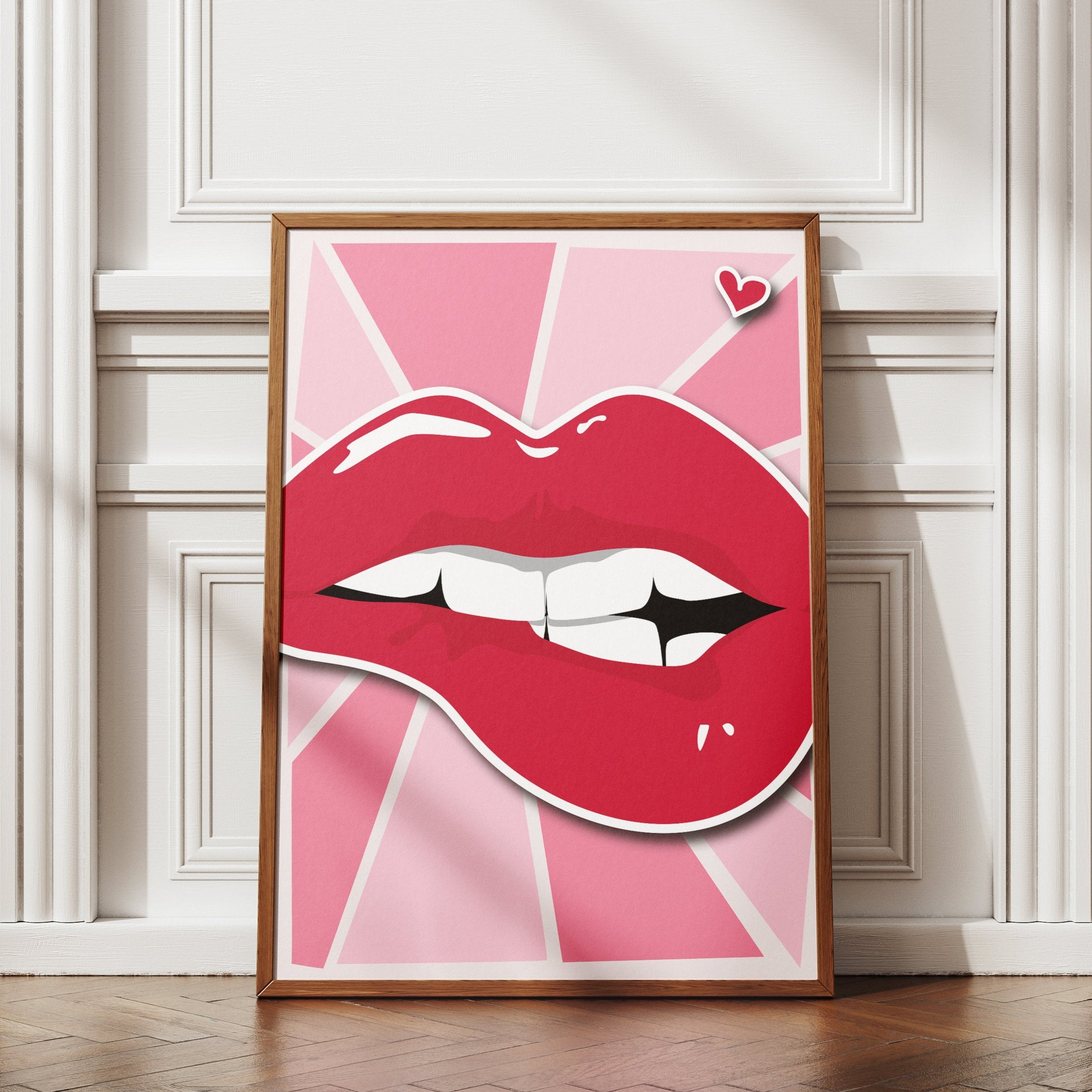 Large luscious lips. Woman biting her lip poster with lots of pink! Downloadable print for wall art and stationery. Maximalist, bright digital artwork poster. Statement home decor, boho, eccentric. This striking piece of art is sure to catch everyone's attention, and created specifically to bring interest to your walls.