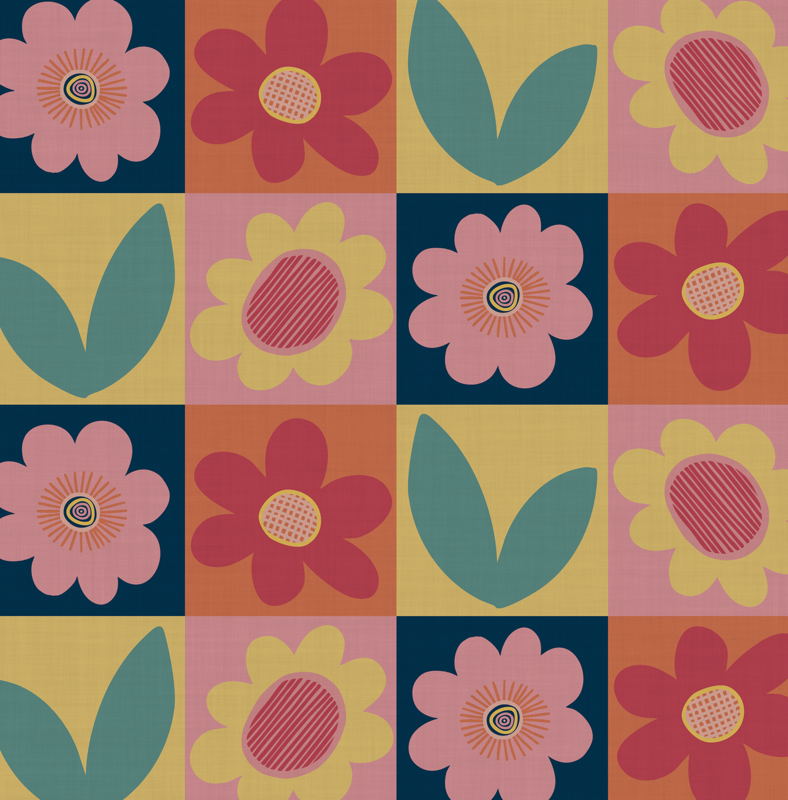 A retro floral check pattern featuring alternating flower and leaf motifs in warm, coordinated colours. Designed as a smaller-scale coordinating print, this seamless repeat is perfect for quilting, apparel accents, and detailed sewing projects.