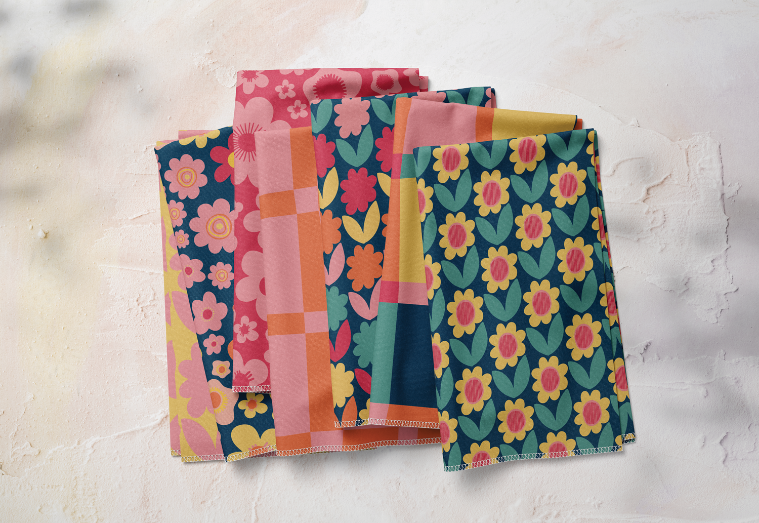 A curated set of seamless surface patterns inspired by floral patchwork, retro colour palettes, and organic shapes.